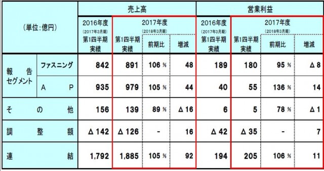 YKKグループが8月9日発表した2017年度第一四半期の連結決算は、売上高1885億円(前年同期比5.2%増)、営業利益205億円(同6.1%増)、経常利益211億円(同17.7%増)だった。