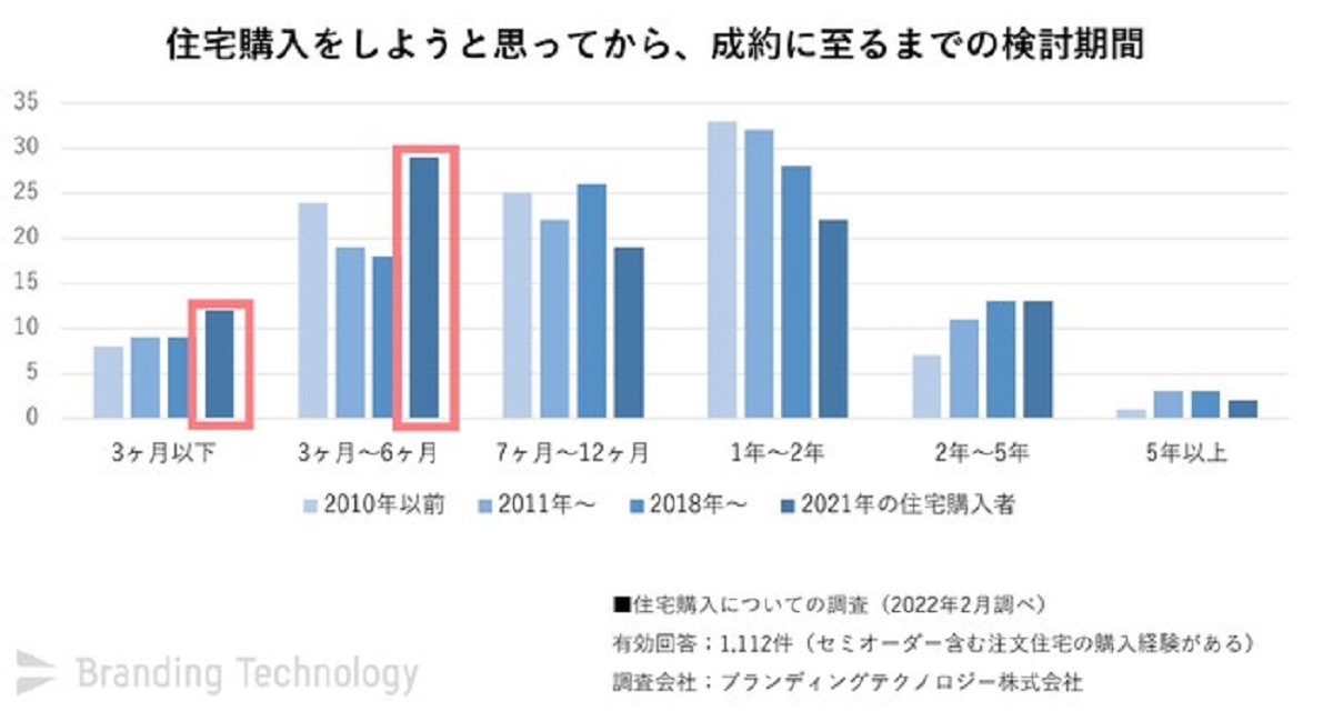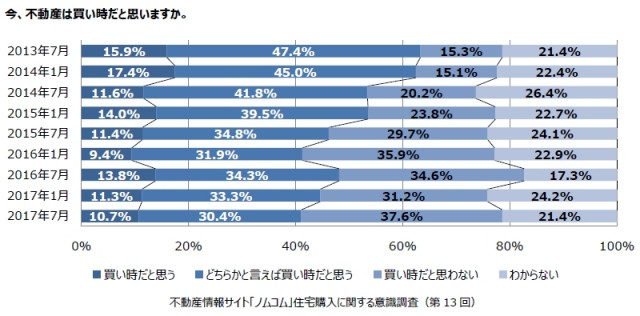 不動産の買い時感について、「買い時」(「買い時だと思う」「どちらかと言えば買い時だと思う」)と回答した人は41.1%で、前回調査(今年1月)に比べて3.5ポイント(pt)減少した。一方、「買い時だと思わない」の回答は6.4pt増の37.6%だった。