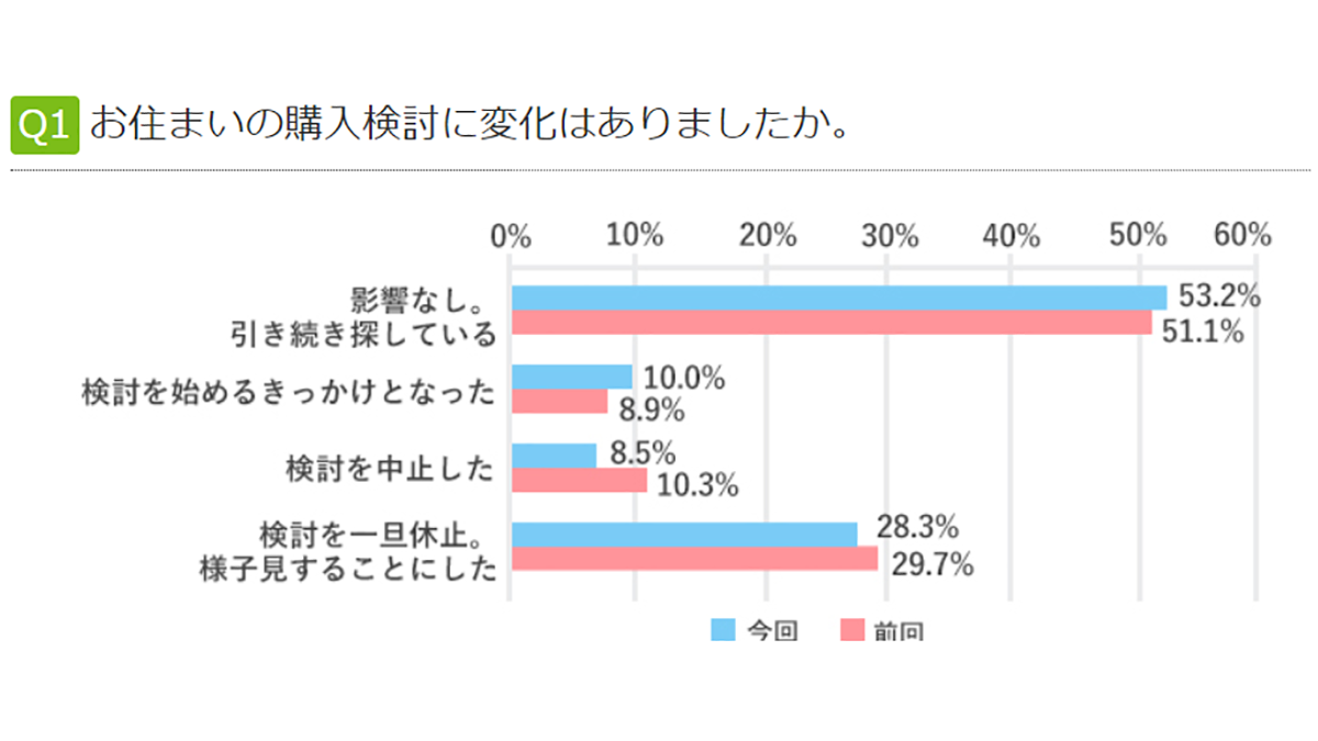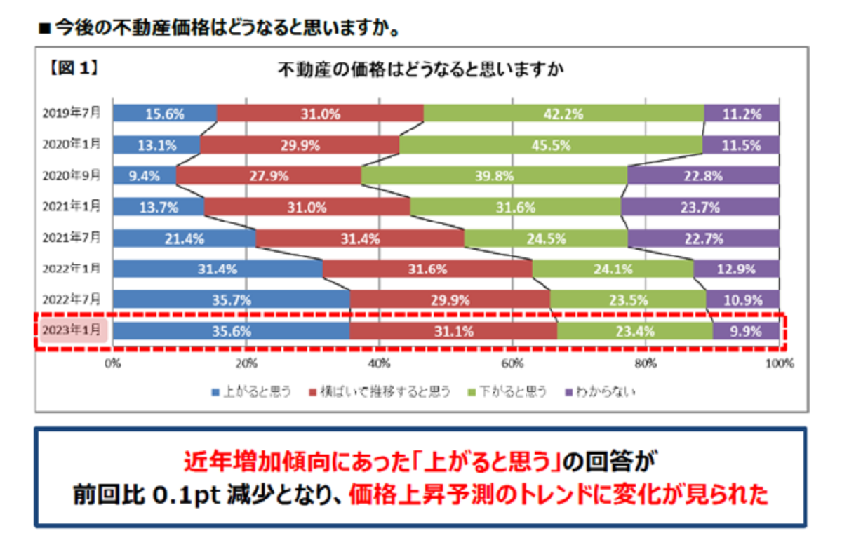 また、今後の不動産の価格について、「下がると思う」と回答した人は34.4%(前回比7.1pt増)、「上がると思う」と回答した人は22.9%(同0.3pt減)だった。