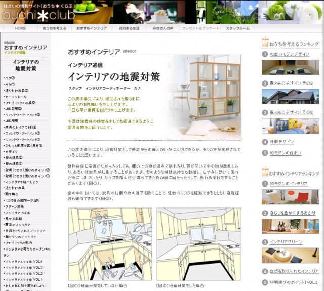 具体的には、インテリア通信で、インテリアの地震対策における「家具の転倒防止」、「扉の開閉防止」、「展示品の転倒防止接着剤」についてサイト内で紹介。製品の問い合わせ先なども掲載した。