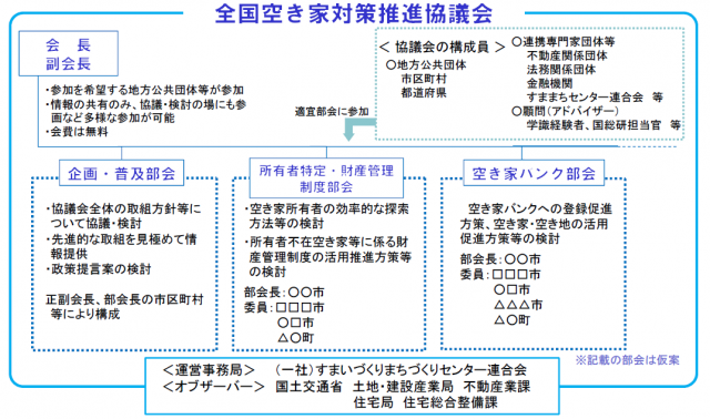 同協議会は、地方公共団体等による空き家対策の取組の広がりを踏まえ、空き家問題に係る情報の交換・共有、法務・不動産等の専門家等との連携による対応策の協議・検討、実践的な空き家対策の政策提言等を行うことを目的としたもの。8月24日現在の参加団体は、正会員(地方公共団体)950団体と、連携専門家団体、顧問で構成される。