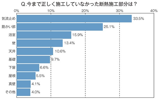 2016年度の同講習会修了時に実施したアンケート調査では、「今まで正しく施工していなかった断熱施工部は?」との問いに対し「気流止め」との回答が33.5%、「筋かい部」が25.1%と続いた。さらに「難しい・やりにくいなと感じた断熱施工の部分は?」との問いには「筋かい部」が30.4%、次いで「気流止め」が22.2%との結果に。自分が正しい施工方法を行っていなかったと気づいておらず、本講習会を受講したことで正しい施工方法の難しさを知ることができた受講者が3割にのぼることがわかった。