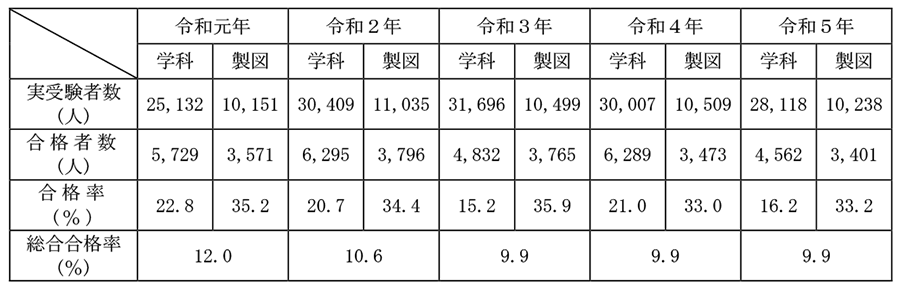 受験資格別における「大学」の割合が前年比1.6ポイント増の72.1%、年齢別の「24~26歳」の割合が前年比1.7ポイント増の23.9%を記録。建設業界での若手に対する取得要請を反映し、受験資格を得た大卒、大学院卒の人が早い段階で学科試験を受験、合格することが主流になっていると考えられる。