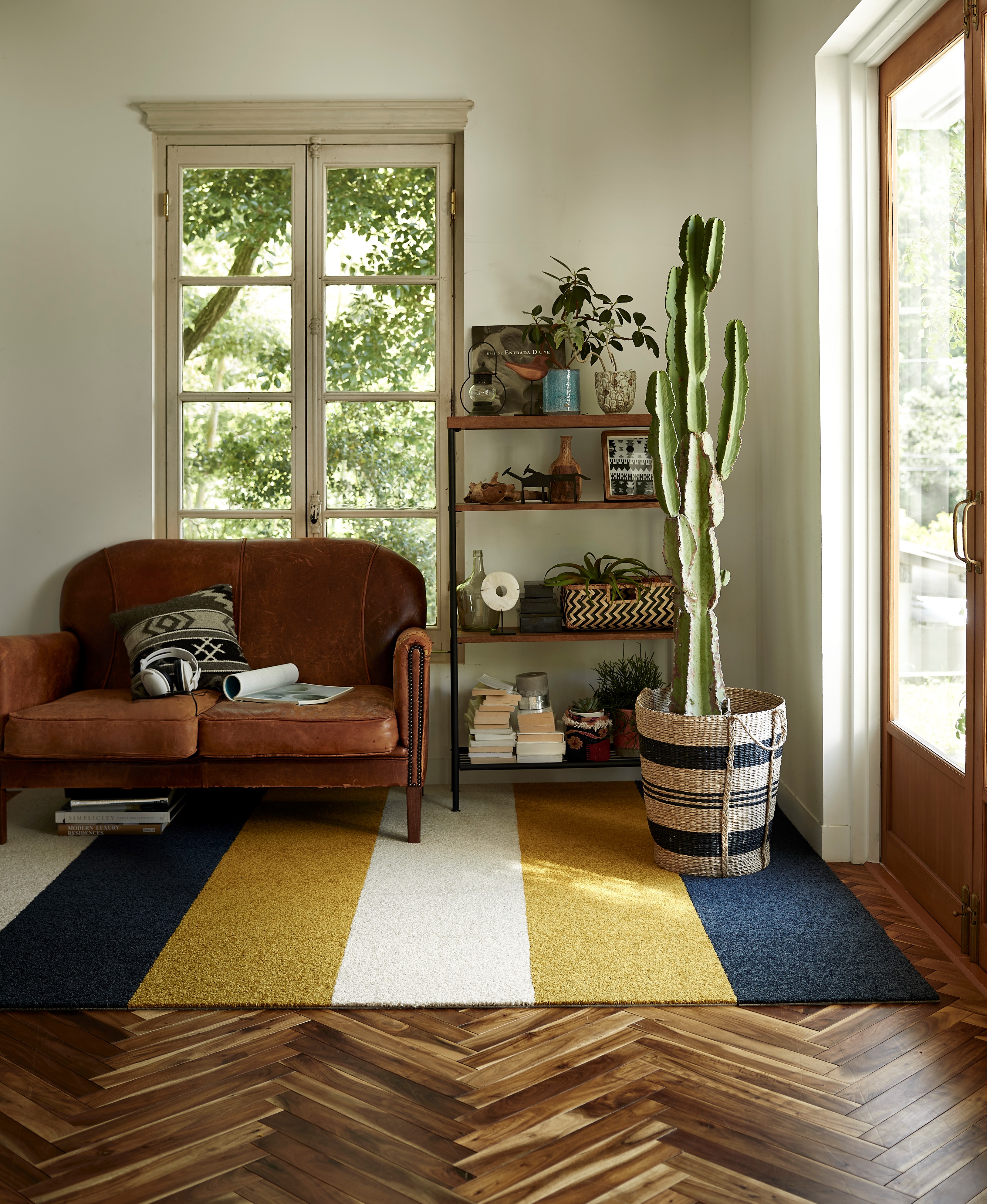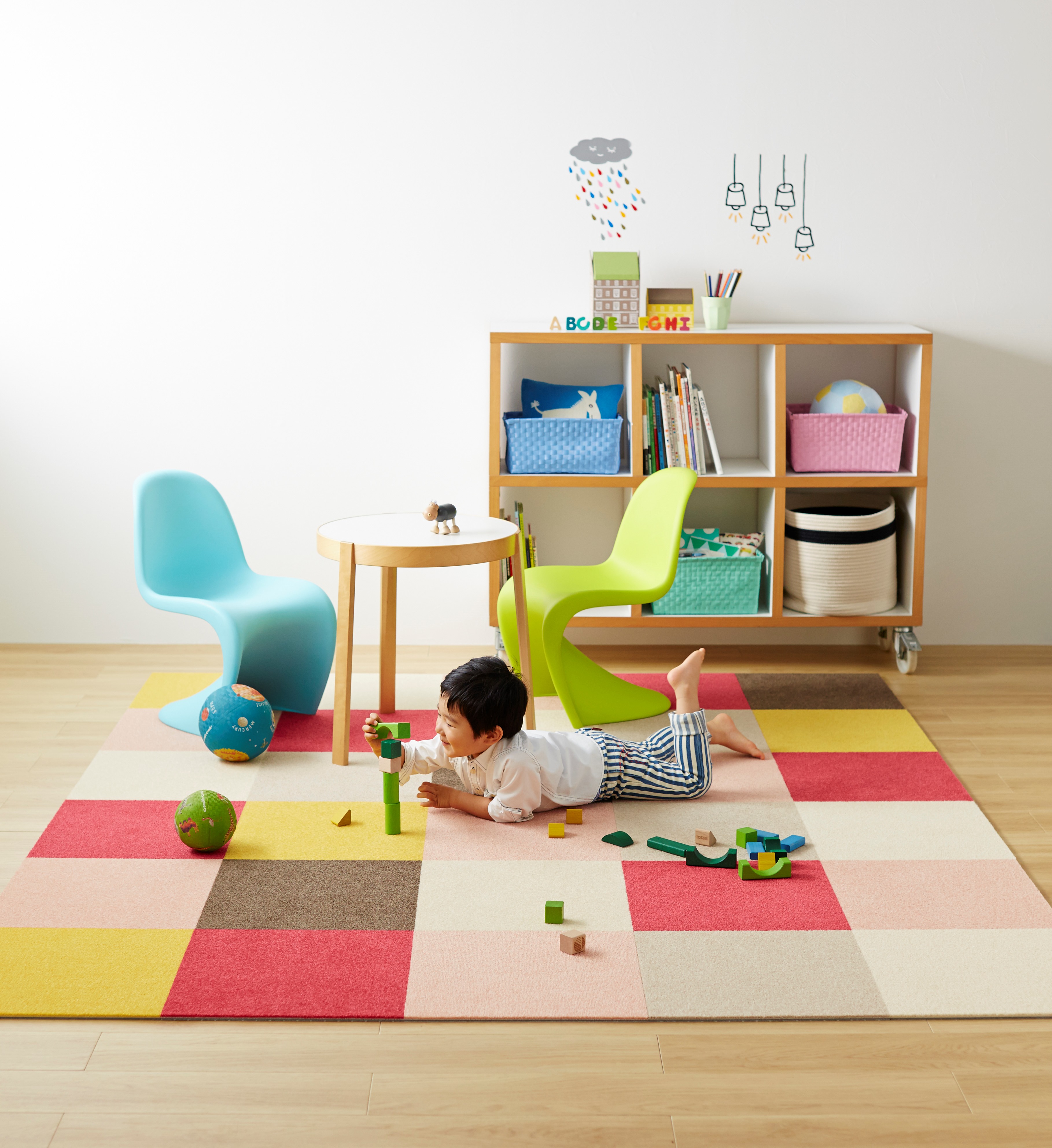 「アタック270キャンバスファイン」無地カットパイル品で、スムース加工により足触りが滑らか。スノー、ローズのほか、新色としてチョコ、ラムネを追加した。