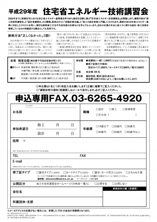 内 容 2020年までに新築住宅における改正省エネルギー基準適合率100%達成を目標に掲げ、工務店の設計者や大工、現場管理などを対象に開催するセミナー。「施工技術者講習会」と「設計者講習会」の2種類があり、後者はさらに「詳細計算法編」と「省エネ設計実務入門編」に分かれる。最新の2016年省エネルギー基準に対応したテキストを用い、適切な断熱施工方法や外皮性能の計算などを半日かけて学んでいく。