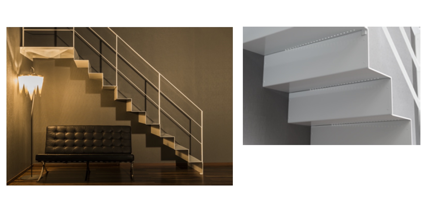 エレメントをとことん削ぎ落とすことで、横からみると1枚板を折り曲げただけのようなシンプルなフォルムを実現。有効幅は910・750。手すりは横桟とワイヤーを用意した。 参考設計価格95万5000円(13段、横桟片手すり)。