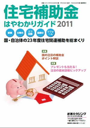 新建ハウジングは5月30日、フリーマガジン「住宅補助金はやわかりガイド2011」を発行しました。国や自治体などが実施する住宅関連の補助・助成制度を、自治体にアンケート調査を行って一覧で紹介。また、その利用のポイントなどを、住まい手にもわかりやすく、なるべく平易な言葉を使ってまとめています。ぜひご活用下さい(編集部)。