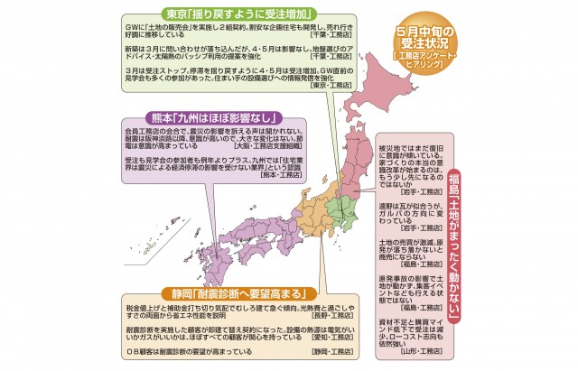 中部・東海以西では、受注・集客のペースはほとんど変わらず顧客の住宅取得意欲やニーズも変わらない、という声が目立った。「契約間近の顧客が様子見・計画延期に転じた」(複数の工務店)など建て控え傾向も聞かれたが、その数は各社1人ほどで少なく、すでに計画を再開したという動きもある。