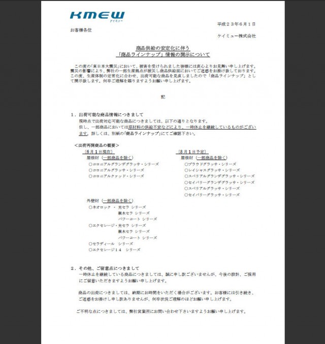 ケイミュー(旧クボタ松下電工外装)は、東日本大震災で同社生産拠点が被災したのをうけ供給商品を限定するなか、6月1日時点で出荷可能な商品の一覧を公表した。