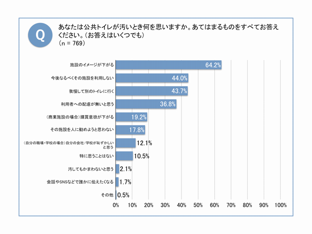 アイカ工業(愛知県清須市)は11月9日、全国の20歳から69歳の男女を対象に実施した「トイレの快適利用に関する意識調査」(有効サンプル=800人)の調査結果を発表した。公共トイレが汚いときに、6割以上の人は「施設のイメージが下がる」と答えた。