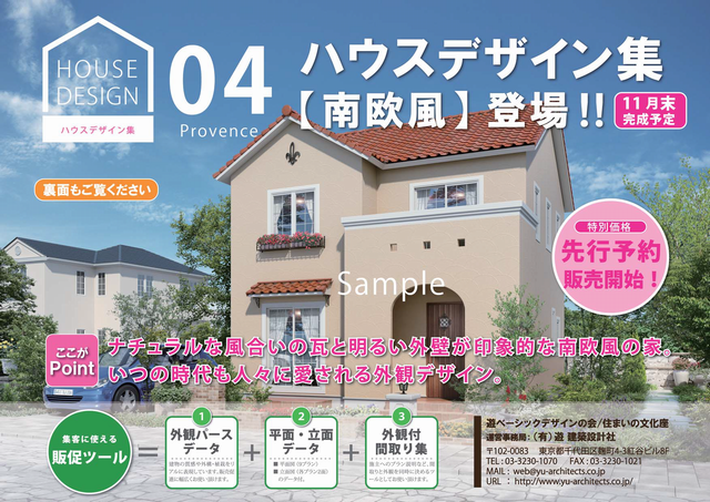 遊建築設計社が運営する遊ベーシックデザインの会(東京都千代田区)は、「間取り」と「外観」を同時に案内するツールとして活用できる「ハウスデザイン集」に、新たに「南欧風タイプ」を追加する。「モダンタイプ」「和風タイプ」「洋風タイプ」に続く4シリーズ目で11月末に発売予定。