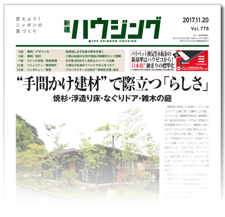 同社では、このイメージを具体化する手段として「fan material(ファンマテリアル)」「fan landscape(ファンランドスケープ」という2つの会社を立ち上げた。「工務店らしい」オリジナル製品の開発を行うとともに、今後、各地の地域工務店に販売していく手間をかけた建材で量産との明確な差別化を図り「工務店らしさ」のブランド化を狙う方針だ。