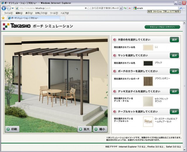 同サイトでは、同社の主力商品「ポーチガーデン」を設置する際に、色や商品内容を、利用者の自宅の外壁、サッシ色、床材に合わせてシミュレーションできる。