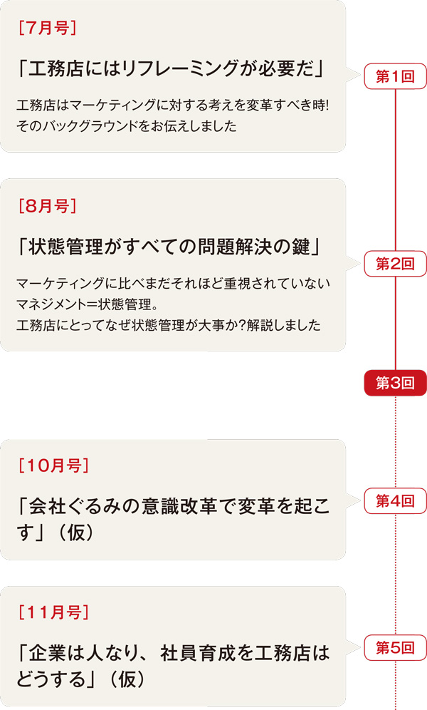 「経営を圧迫する急激な職人不足と販促費の増加。仕事をつくるための販促費の捻出のために、職人の賃金を抑え、結果として、仕事が取れても仕事をする職人がいなくなるという悪循環にはまる。すみれ建築工房(兵庫県神戸市)の高橋剛志社長は、販促費にかかる経費を職人のために回すことで、意識の高い職人を強みとしたインバウンド・マーケティングを実践し、業界の抱える悪循環の克服に取り組んでいる。その極意を全12回の連載で伝えていただく。(編集部)