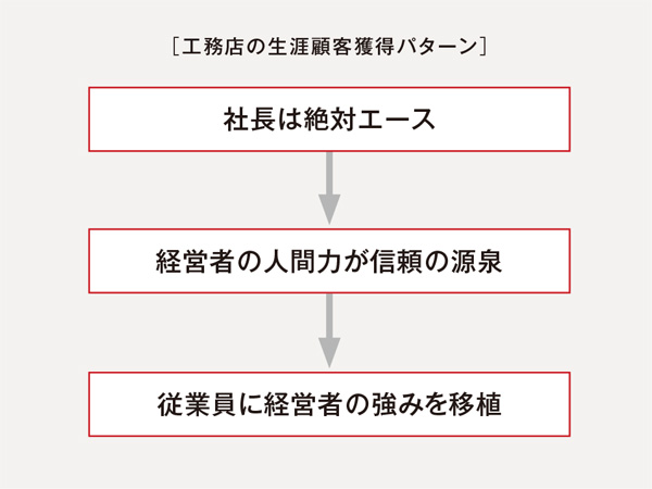その答えは実はそんなに難しいものではありません。それは、どの工務店に訊いても生涯顧客といわれるV I P客を持っていると述べられるからであり、その生成のプロセスを伺うと、社長、経営幹部が顧客接点の窓口を務めていたから、といった理由が極めて多い。営業スキルの有る無しとは大して関係がありません。どのような小さな工務店でも責任を負うもの、裁量を持つものが顧客接点を務めるという程度で顧客との信頼関係の構築を成しており、別段変わった方法やノウハウは必要ではないからです。