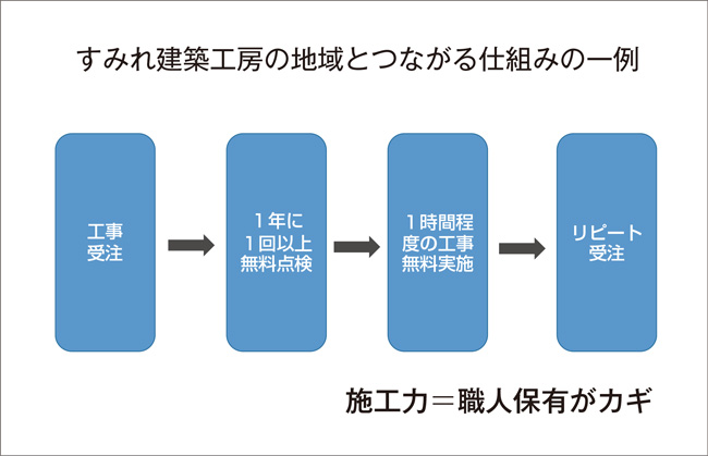 因みに弊社の場合はどんな小さな工事でも一度お付き合いを頂くと、それからずっと1年に1回以上、大工が無料メンテナンス訪問に伺って、1時間程度で済む営繕工事は全て無料で行います。この大工による無料巡回訪問の仕組みが機能し始めてからお客様からの紹介、リピートの受注が圧倒的に増えて、広告宣伝を全てやめた経緯があります。