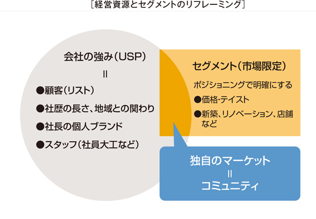 顧客リストの活用はもっともわかりやすい経営資源の活用の例ですが、マーケティングの根本、目指すべきは自社独自のマーケットを作り上げる事にあります。そのように考えるとコミュニティを形成する人にフォーカスをすること、スタッフや社長の個人ブランド、社歴の長さや地元との関係性などコミュニティ作りに使える経営資源はたくさんあるのではないでしょうか。