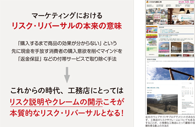 分かりやすい例では数年前の同時期にマクドナルドとペヤングで起こった異物混入事件。マクドナルド社はCEOが記者会見で申し開きをしましたが社内通達を出す程度の対応しか取らずに販売を続け、消費者からの信頼を失って赤字に転落するまで販売実績を落としました。対してペヤング社は自らの非を認め、出荷している全ての商品を引き上げて在庫品と共に全て焼却処分とし、製造ラインの見直しを行い半年近く販売を中止、経営的に大きな痛手を受けながらも、発売を再開すればインスタント焼きそばのシェアでトップに躍り出るほど復調したのです。まさにリスクをリバースした事例ですが、今の世の中の風潮に適応するならば、自らの弱み、至らぬ点を明らかにすることが消費者から信頼を得る上で非常に重要になってきます。職人起業塾ではクレーム公開を強く推奨していますし、私自身もお客様に苦言を呈される度にブログでその原因と今後の対策を書き記す様にしています。