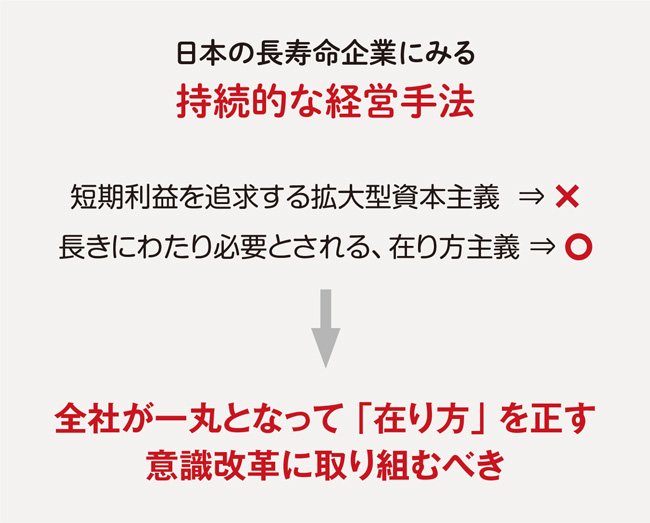 日本に10 万社以上あるとされる創業100年以上の企業のほとんどは中小零細企業の職人的ものづくり企業です。グローバルな拡大戦略を立てて株主配当を担保するべく短期利益を上げることにコミットする、今をときめく欧米型資本主義の世界的大企業とは真逆のビジネスモデルではありますが、地域に根を張り、人材育成という未来への投資を行うことで、企業の大きな目的である存続し続けることが、実践できると思っていますし、また工務店は地域のインフラを支える重要な責任を負っている以上、存続し続けなければなりません。その為に今こそ、ステークホルダーを含めた全社が一丸となって在り方を正す意識改革に取り組むべきではないでしょうか。