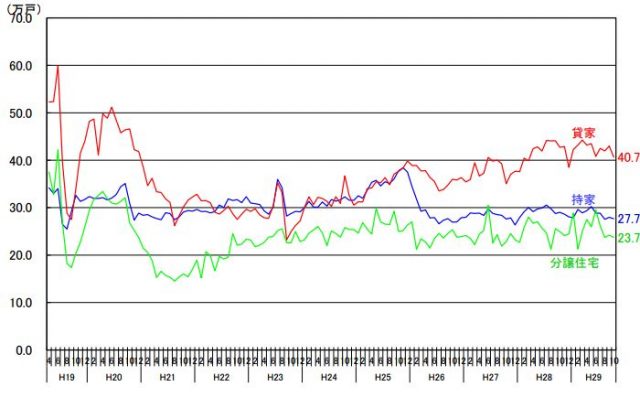 持家は実数ベースで2万4807戸、前年同月比4.8%減となり5ケ月連続の減少。貸家も同4.8%減の3万8017戸で5か月連続の減少となった。また、分譲住宅はマンションが前年同月比16.9%減の7489戸、一戸建ては増加し1万1861戸(同5.0%増)だった。