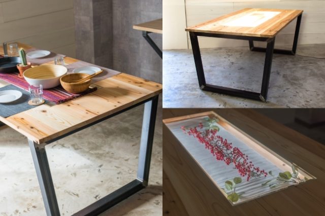 販売第一弾として、「オープンシェルフ」「シンプルテーブル」2種とダイニングテーブル「灯(ともす)」をはじめとした各種オーダーサンプルを用意。テーブルの中心に空間をつくり、自由に演出できる「灯」にはブランドのコンセプトが落とし込まれている。木の色調やライトの有無など、柔軟なオーダーが可能。
