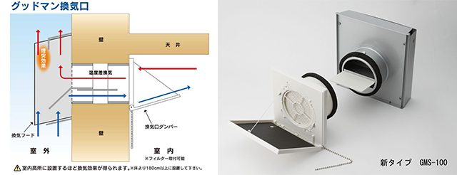 グッドマン(北海道札幌市)は、2017年度北海道発明協会会長賞を受賞した、温度差換気や風力換気を利用し自然給排気を行う「グッドマン換気口」を販売する。