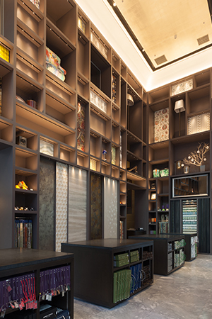 同ショールームは、高さ8mの吹き抜けに造作されたグリッドシェルフを、壁紙やファブリックス、家具などのインテリアアイテムで飾りつけることで、同社の洗練された世界観を表現している。