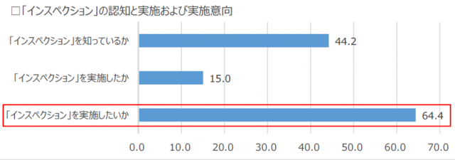 一般施主の「インスペクション」に関する「認知率」「実施率」「実施意向」を調べたところ、「認知率」については「知っている」「聞いたことがある」を合わせて44.2%、「実施率」は15.0%となり、ともに5割に満たなかった。それに対し、改めて「インスペクション」を説明後、一般施主の全回答者に「実施意向」を聞いたところ、「かなり実施したい」「やや実施したい」との回答が6割を超えた(64.4%)。特に、売り主サイドにおいても「実施意向」が62.4%と高く、「インスペクション」が「売却後のトラブルを防ぐもの」との考えが浸透した様子が窺えた。