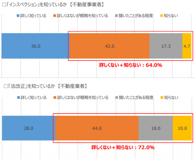不動産事業者に対して、「インスペクション」について「どの程度知っているか(理解度)」を聞いたところ、「詳しく知っている」は36.0%にとどまり、「概略を知っている程度」(42.0%)、「聞いたことがある程度」(17.3%)が合わせて64.0%となった。また今回の法改正への理解度についても聞いたところ、「詳しく知っている」は3割に満たなかった。