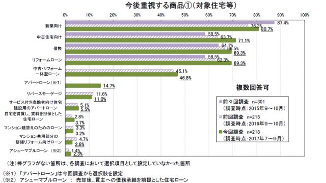 取扱中の商品では、「新築向け」「中古住宅向け」「借換」「リフォームローン」について大部分の回答機関が取り扱うなか、「リバースモーゲージ」が前回調査から5.3ポイント上昇して16.0%となった。今後重視する商品では、「新築向け」が80.7%で最多、次いで「中古住宅向け」(71.1%)、「借換」(69.3%)となった。前回調査との比較では「中古住宅向け」「リフォームローン」がそれぞれ7.4ポイント、7.0ポイントの増加を見せた。