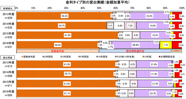 2016年度新規貸出額の金利タイプ別構成比は、「固定期間選択型(10年)」が28.8%となり、前回調査(2016年9月~10月)比10.6ポイントの大幅増加を示した。「変動金利型」は49.9%で同11.9ポイント減少した。新規貸出額の対前年度増減では、借換について「大幅増」と回答した機関が26.1ポイント増の47.3%となった。