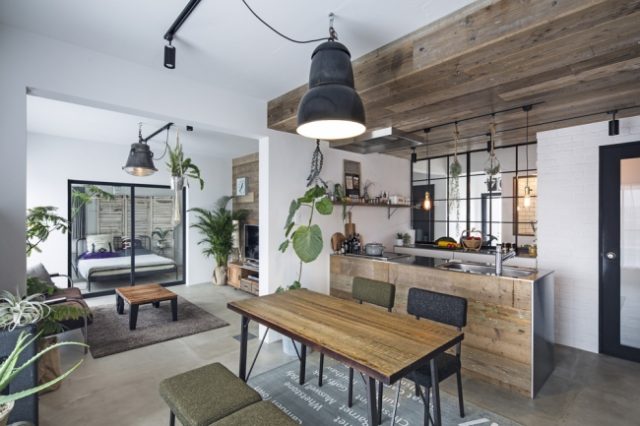 1位は、東京リノベの「壁式構造のマンションでも叶う モルタル床に光を取りいれた、素材を楽しむ上質リノベーション」が獲得。間取りの変更が難しい構造でも、床をモルタルで統一し、透明ガラスの建具を使うことで十分な採光と風通しを確保。古材を組み合わせた室内は、落ち着いた大人スタイルとなっている(写真下)。