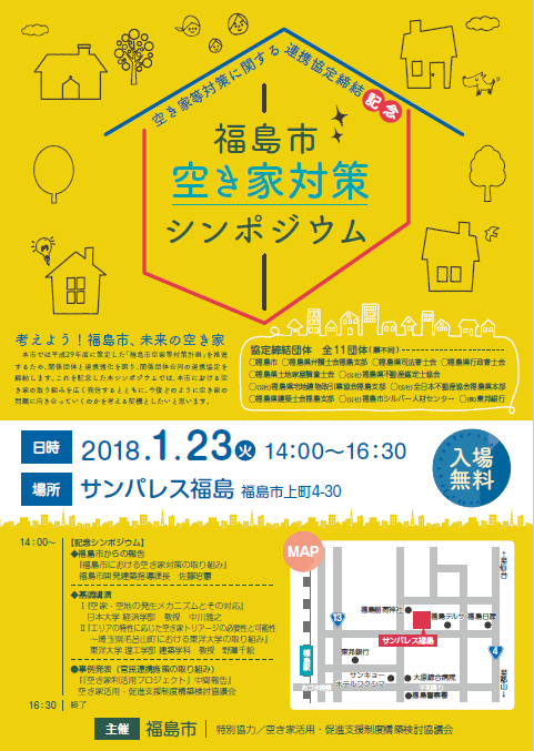福島市は1月23日、「福島市空家等対策計画」に基づき、地域が一体となった空き家対策を推進するため、11の関係団体等合同による連携協定を締結する。同日に締結式を行い、協定締結を記念する「福島市空き家対策シンポジウム」を開催する。