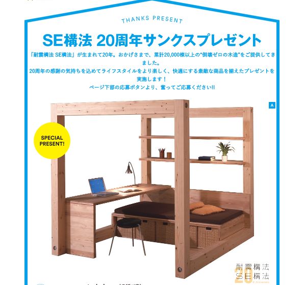 エヌ・シー・エヌ(東京都港区)は、木造システム「耐震構法 SE構法」の発売20周年を記念して、3月31日までプレゼントキャンペーンを実施する。