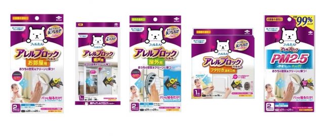 従来から販売している「ホコリとりフィルター」シリーズの通気口用と網戸用のフィルターを厚手化し、抗アレル物質加工をほどこしたもの。