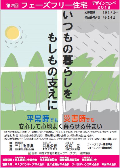 NPO法人フェーズフリー建築協会(東京都文京区)は、「第2回フェーズフリー住宅デザインコンペ2018』の参加登録を1月17日より開始した。