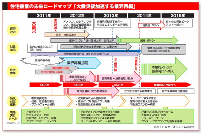 下図は、今回の震災後から2015年までの経済政治環境、住宅産業環境がどのように変遷するのか、その経営環境変化によって住宅産業はどのような影響を受けるのか、それに対して当社はどのように適応しようとしているのかを時系列で整理したものである。