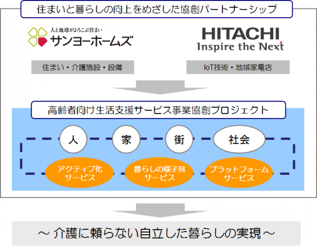 同プロジェクトでは、日立の持つIoT技術と、サンヨーホームズの住まい・介護施設や関連設備を活用して、人・家・街・社会をデータでつなぎ、家庭での高齢者の見守り支援サービスや、高齢者の健康を維持するサービスの展開を目指す。