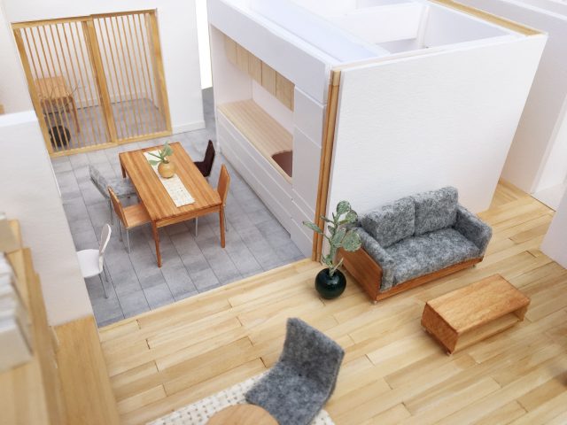土間エリアとリビングエリアは引き戸でつながりながらも、