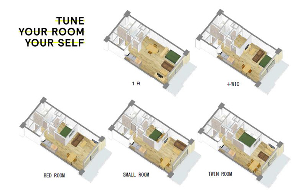 壁の仕上げ素材は、「ナゴミウォール」(塗装壁+障子)、「キナリウォール」(コットンリネンの壁+木製ガラス戸)、「ブコツウォール」(シナ合板+アイアン窓)の3種類から選ぶことが出来る。