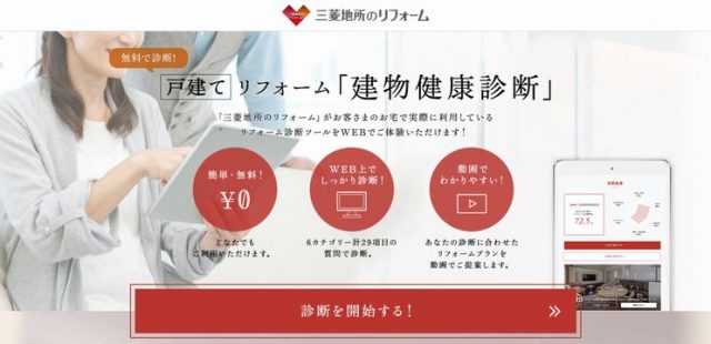 三菱地所ホーム(東京都港区)は1月30日、建物診断ツール「戸建リフォーム 建物健康診断」をウェブ上で利用できるサービスを開始した。自己診断でリフォーム必要度がわかり、診断結果に基づいたリフォーム内容が動画でわかりやすく案内される。