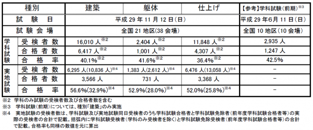 合格者の種別内訳は、「建築」が3566人(合格率=56.6%)、「躯体」が731人(同=52.9%)、「仕上げ」が3368人(同=52.0%)だった。