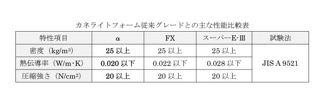 独自の高断熱性発泡剤の高濃度分散技術などによって熱移動を抑制。従来の「カネライトフォームスーパーE-Ⅲ」(熱伝導率0.028)と比較して約30%、これまでの同社最高性能の「カネライトフォームFX」(同0.022)と比較してさらに約10%断熱性能を向上している。