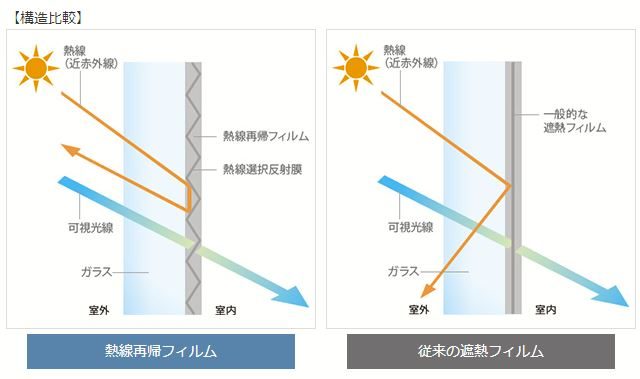 特殊な反射膜が日射に含まれる熱線(近赤外線)のみを選択して上方向へ反射する熱線再帰フィルム。室内への熱線侵入を70%カットするとともに、建物からの熱線反射による地表面の温度上昇を抑制する。明るさに関わる可視光線は67%透過するため、室内が暗くならない。