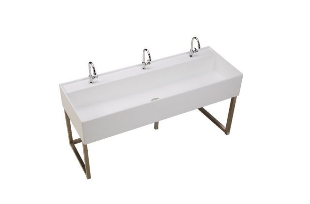 「小学生向け洗面セット」は、メタクリル樹脂系人工大理石製手洗いシンクとステンレス架台のセット。小学1・2年生、3・4年生、5・6年生の平均身長に合わせた3種類の高さと、3人用、5人用の2種類の間口を用意。58万2000円/セット〜。