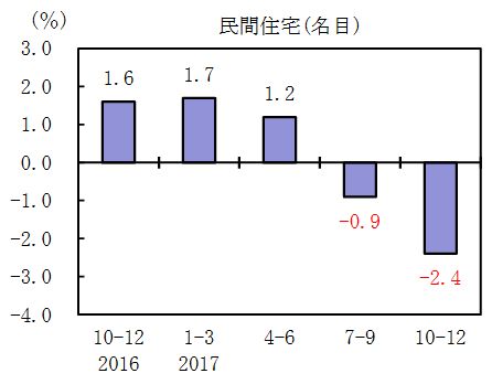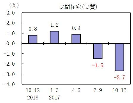 内閣府は2月14日、2017年10~12月期のGDP(国内総生産)の速報値を発表した。民間住宅投資は物価変動などの影響を考慮した実質で前期比2.7%減だった。7~9月期は1.5%減で2四半期連続のマイナスとなった。名目は同2.4%減(7~9月期0.9%減)だった。いずれもマイナス幅が拡大しており、減速感が目立った。