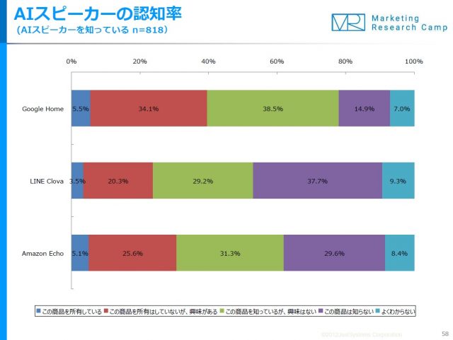 また、AIスピーカーを認知している人のうち、「Google Home」に興味がある人(「所有している」「所有していないが、興味はある」)は39.6%、「Amazon Echo」は30.7%、「LINE Clova」は23.8%だった。