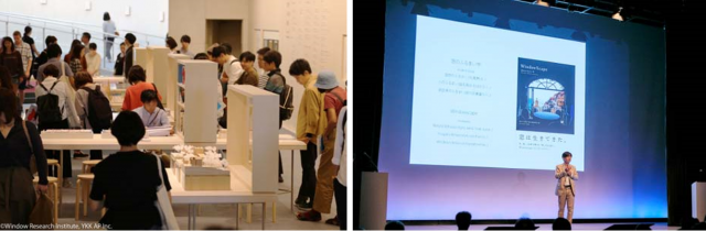 昨年の窓学展(東京開催)の様子 (左)と 「窓学国際会議」(2017年10月)での塚本由晴氏の講演の様子(右)