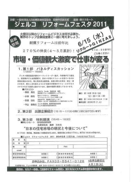 東日本大震災以降、リフォーム業界はどう考え、どう行動していかねばならないかをテーマにパネルディスカッションを実施。「日本の住宅市場の現状と今後について」の特別講演も行う。