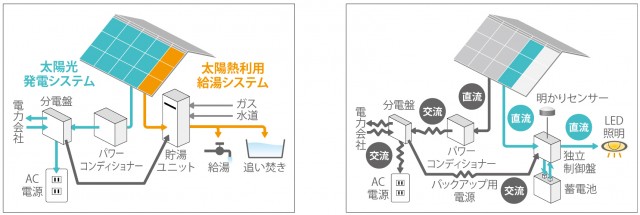 発売するのは、①太陽光発電と太陽熱集熱を一体化した「太陽の光&熱のハイブリッドシステム」、②太陽光で発電した電力を蓄電池に充電し直流のまま夜間のLED照明に使う「独立系直流LED照明システム」、③自然光を反射板ダクトを通じて室内で活用する「光ダクトシステム」、④住宅各部屋の発電量、ガス・電気・水道の使用量を可視化する「光熱費の視える化エコダイエットシステム」―の4技術。